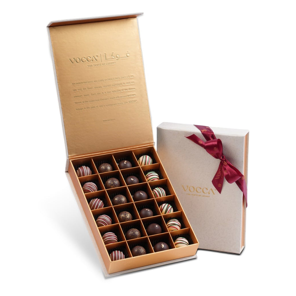 A festive selection of handcrafted bonbons featuring rich, seasonal flavours and smooth chocolate shells. This Christmas assortment includes Dark Orange, Red Velvet, Cinnamon, and a non-alcoholic Rum & Raisin bon bons, each crafted with delicate fillings and holiday-inspired notes. A warm, joyful tasting experience perfect for celebrating the season.