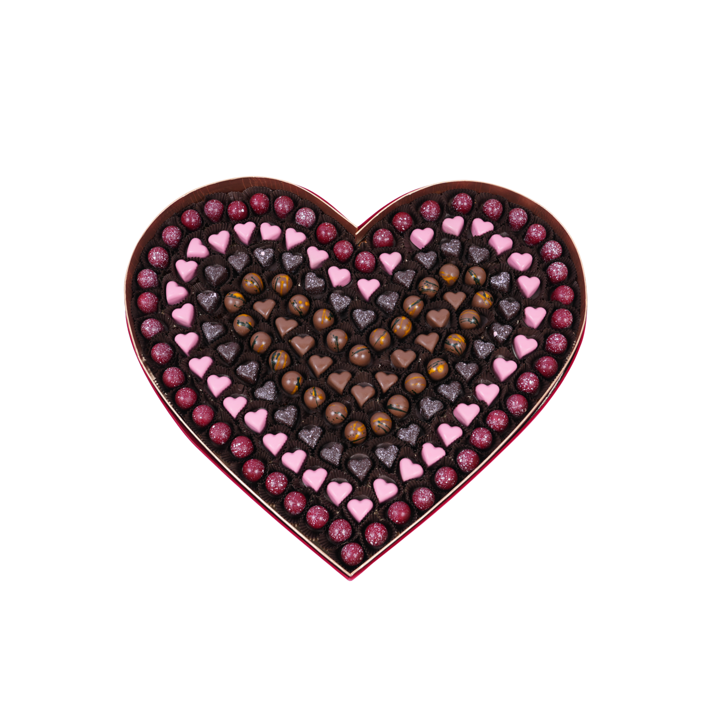 A heart-shaped box filled with 200 handcrafted chocolates generously sized and unapologetically indulgent. Perfect for savoring on your own, no sharing required.