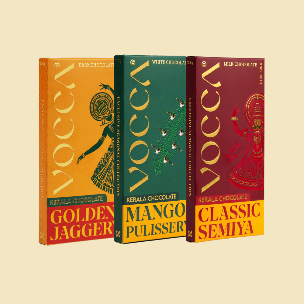 Three uniquely crafted bites inspired by timeless Indian flavors from the comfort of creamy semiya to the richness of golden jaggery and the tangy surprise of mango pulissery. A celebration of tradition, reimagined in chocolate.
