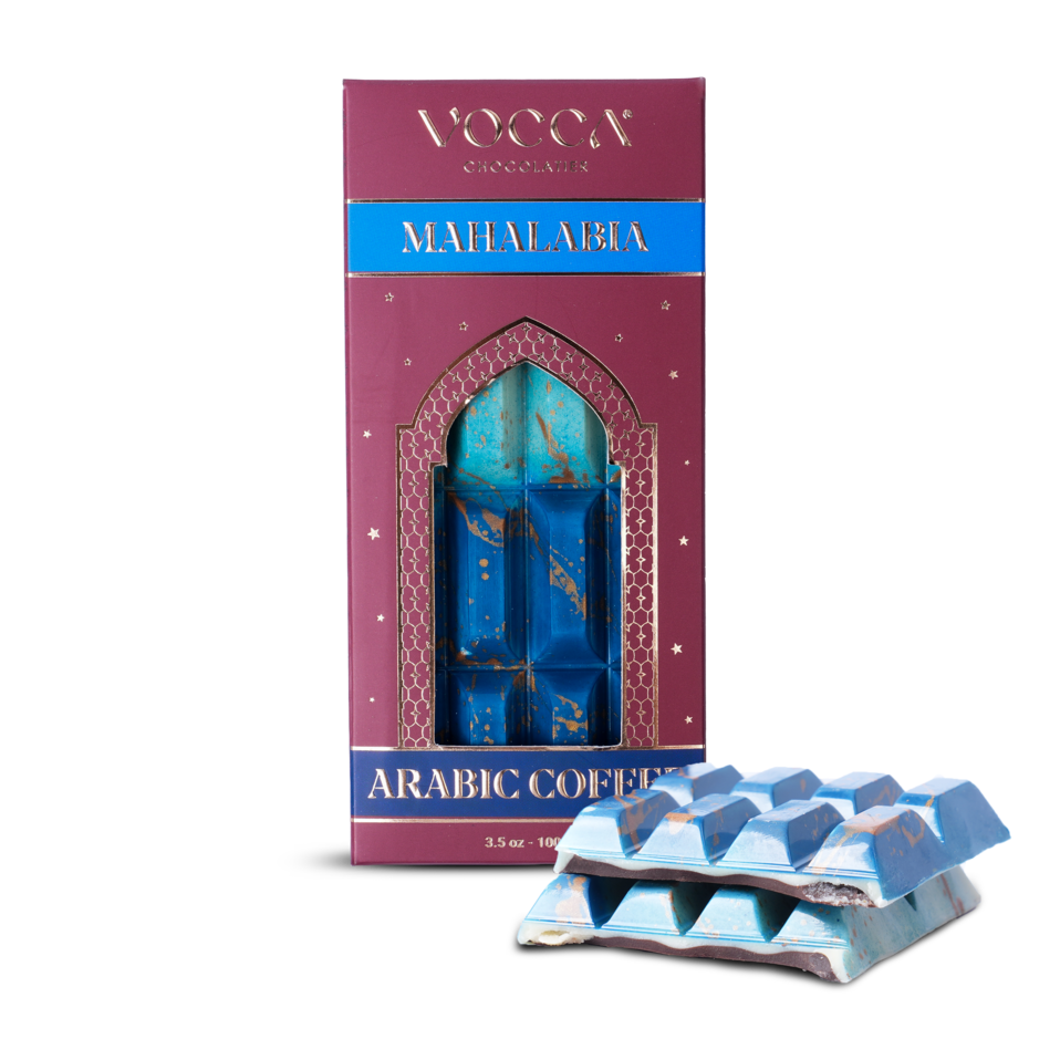 Smooth chocolate bar is crafted in two distinct halves. Creamy Mahalabia offers a soft, delicate sweetness inspired by classic Middle Eastern desserts, while rich Arabic Coffee adds bold, aromatic depth with warm roasted notes. Together, they create a refined balance of comfort and intensity in every bite.