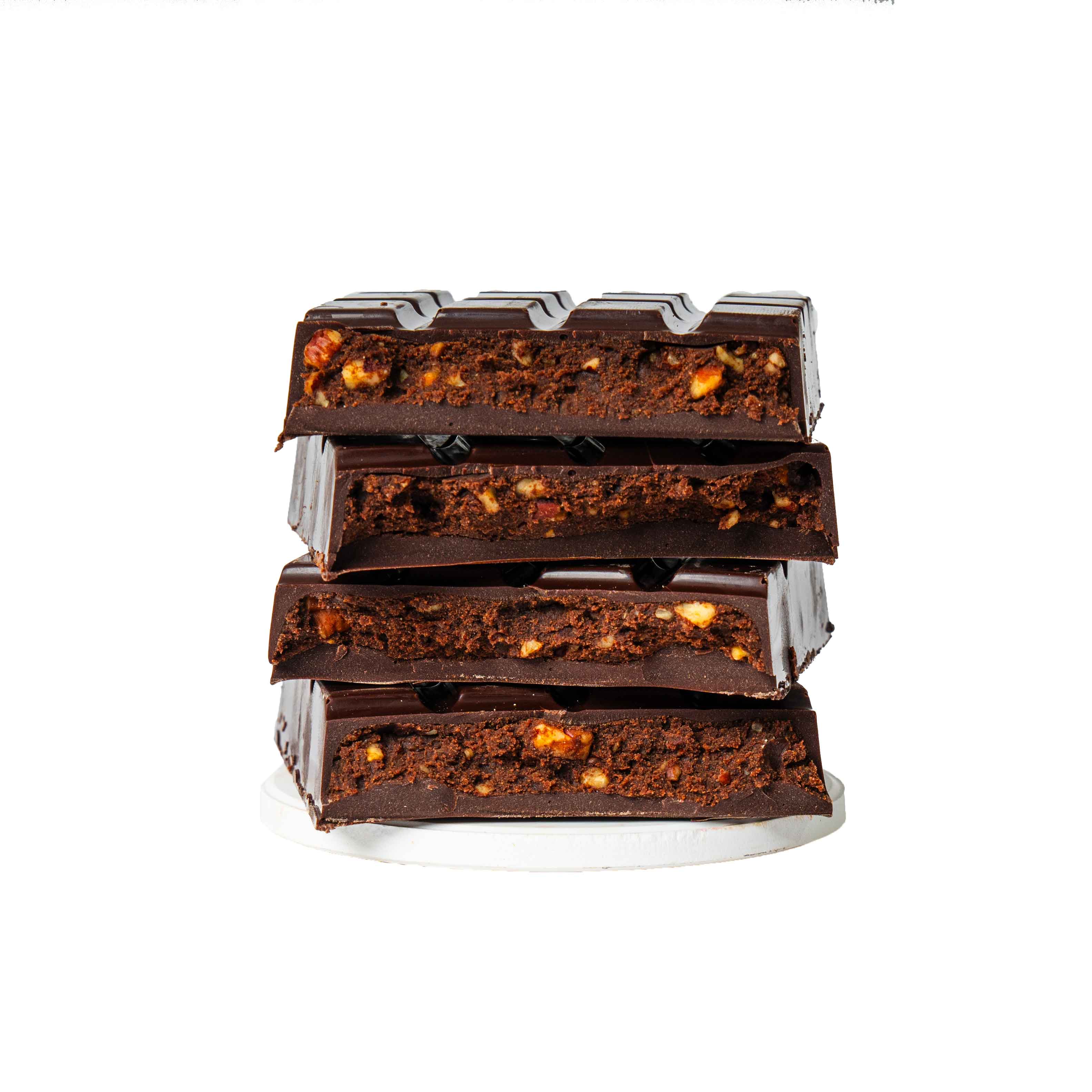 Fudgy Pecan Brownie enrobed in premium belgian dark chocolate to make the perfect chunky bar.