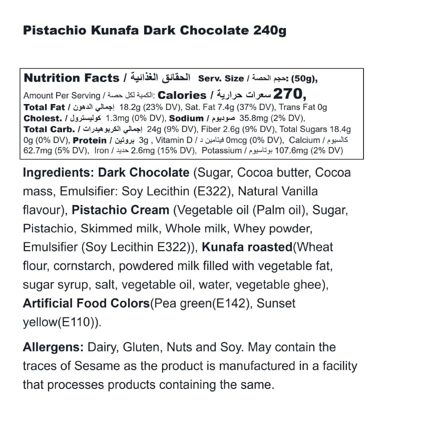 Indulge in the irresistible Pistachio Kunafa Dark Chocolate Bar in a chunky version, a delightful fusion inspired by the viral Dubai chocolate sensation. Each bite unveils a creamy dark chocolate exterior that encapsulates a rich layer of pistachio-infused kunafa, delivering a perfect balance of nutty crunch and velvety sweetness. Topped with a sprinkle of toasted pistachios, this luxurious treat offers a taste of Middle Eastern tradition wrapped in a modern twist. Perfect for chocolate lovers and adventurous snackers alike, it’s a decadent experience you won’t want to miss!