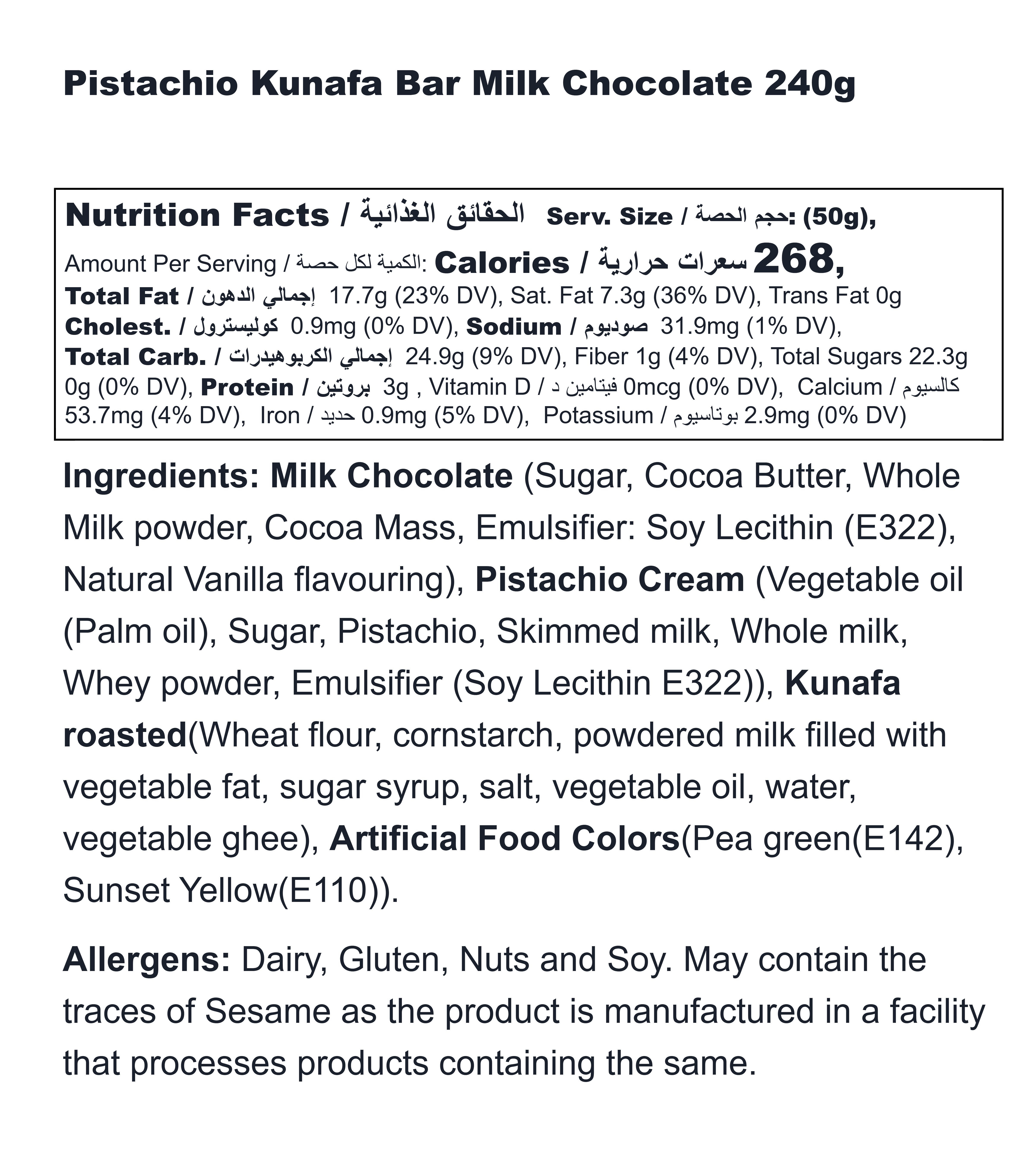 Indulge in the irresistible Pistachio Kunafa Milk Chocolate Bar in a chunky version, a delightful fusion inspired by the viral Dubai chocolate sensation. Each bite unveils a creamy milk chocolate exterior that encapsulates a rich layer of pistachio-infused kunafa, delivering a perfect balance of nutty crunch and velvety sweetness. Topped with a sprinkle of toasted pistachios, this luxurious treat offers a taste of Middle Eastern tradition wrapped in a modern twist. Perfect for chocolate lovers and adventurous snackers alike, it’s a decadent experience you won’t want to miss!