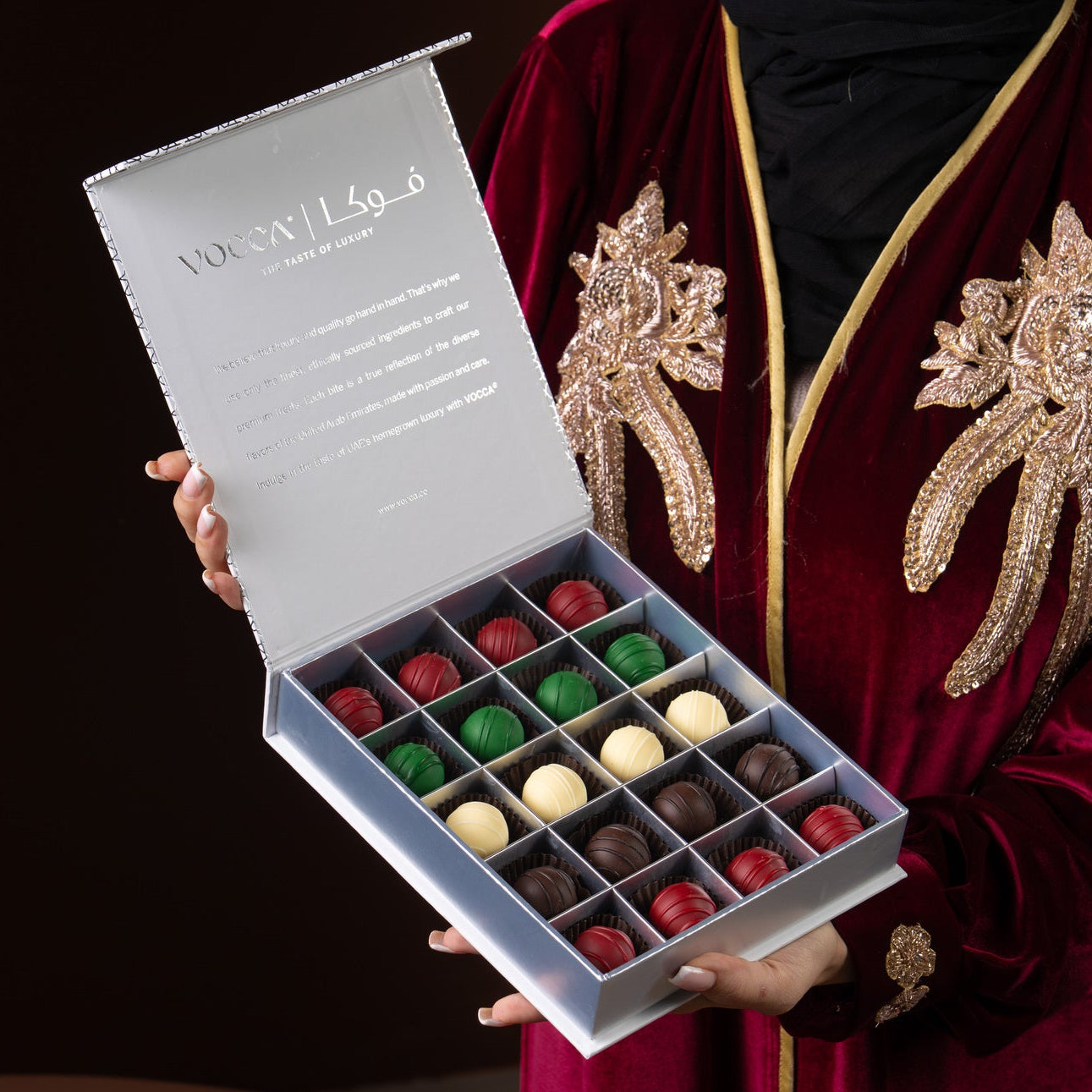 A timeless assortment of luxurious 20pcs chocolate truffles, in elegant Gold box, each crafted to add a touch of festive glamour.